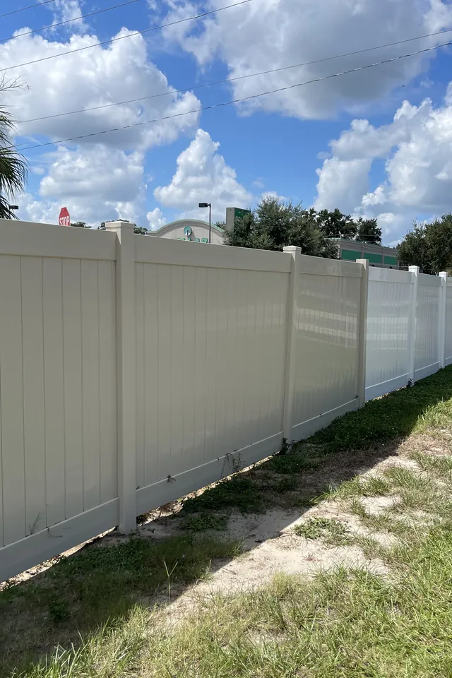 A commercial property manager in Polk County reached out after their large vinyl privacy fencing had accumulated years of green and black algae streaking — the kind of buildup that happens fast in Central Florida's heat and humidity. Multiple fence sections were affected, including a perimeter privacy fence and decorative split-rail fencing along the road frontage. Paver surfaces around the property were also in need of a deep clean.