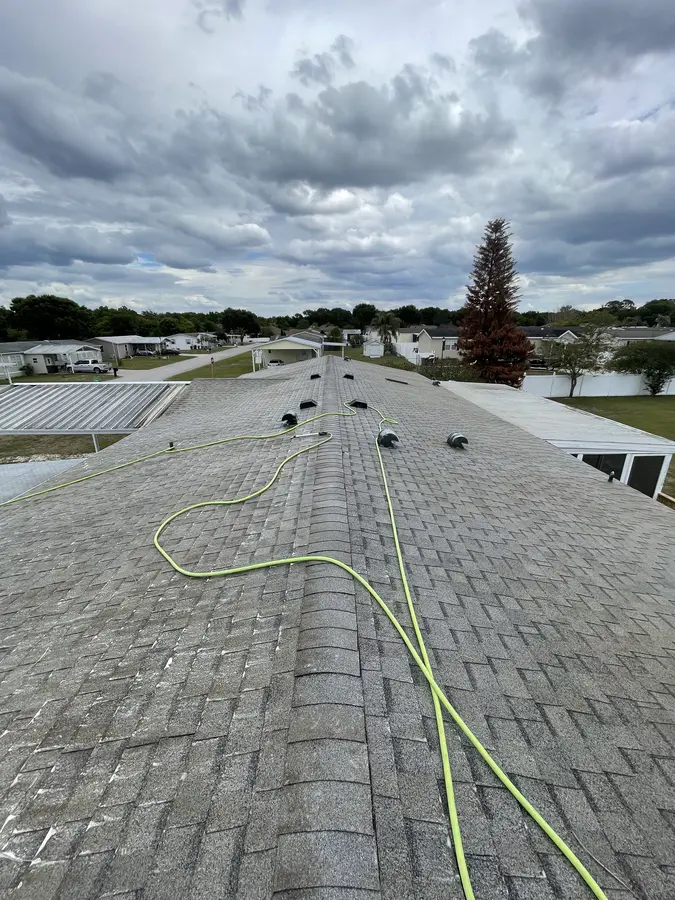The shingle roof had visible algae streaking from ridge to gutter line — that dark, streaky discoloration you see on so many Florida homes. Left untreated, algae eats into the asphalt granules and shortens the roof's life. We treated the full surface with our soft wash mix, let it dwell, and rinsed clean. The result was a uniform, like-new appearance across the entire roof.